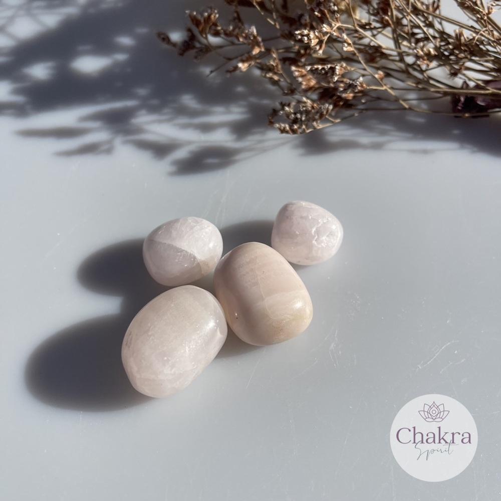 Mangano Calciet trommelsteen is zachtroze van kleur.